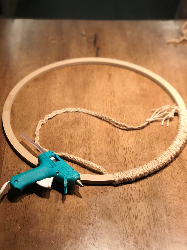 Anywhoooo back to step 2 – take the braided twine and wrap it around the wreath, gluing every other wrap. Make sure you glue to the same side of the ring so everything looks cohesive. The knots on the end of the braids should be cut off but make sure you glue the ends together so they do not peel. These ends should be glued to the back side of the ring so that nothing is showing in the front.